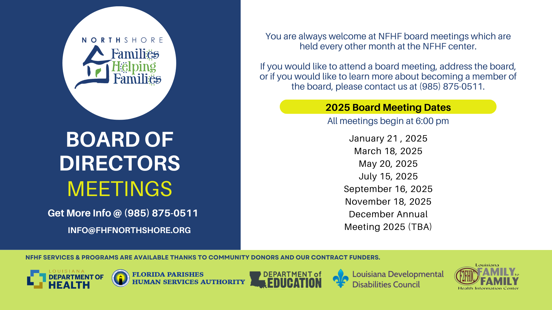 Northshore Families Helping Families is a 501c3 nonprofit established under the guidance of Act 378 of 1989. NFHF is the only family resource center for individuals with disabilities on the Northshore. We give parents of children with disabilities knowledge, support and confidence by providing peer-to-peer support, information; referrals to disability resources and education and training.